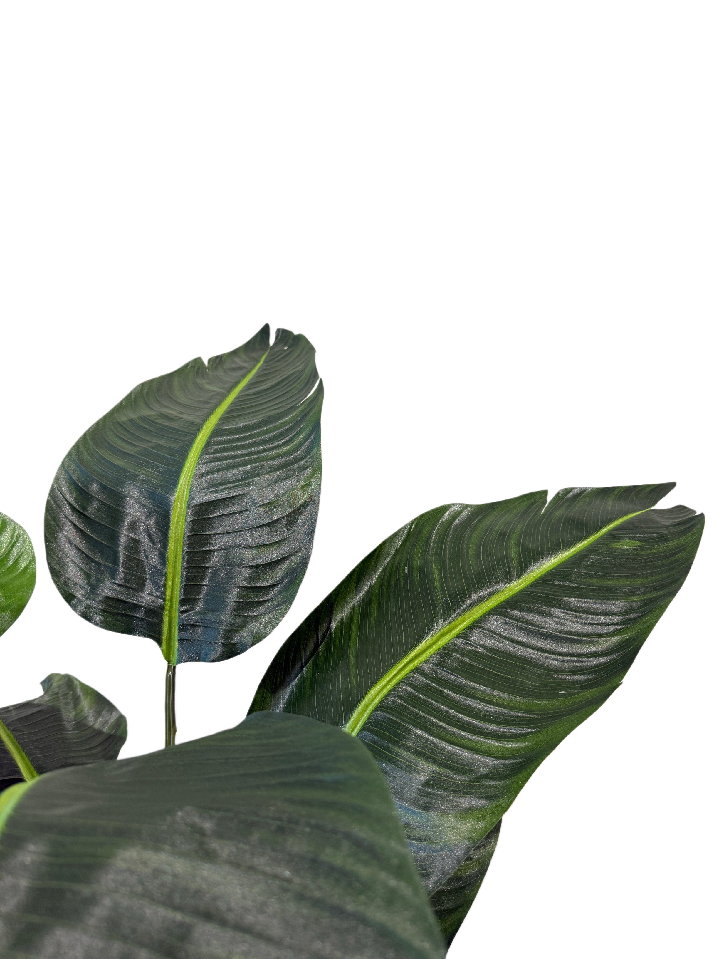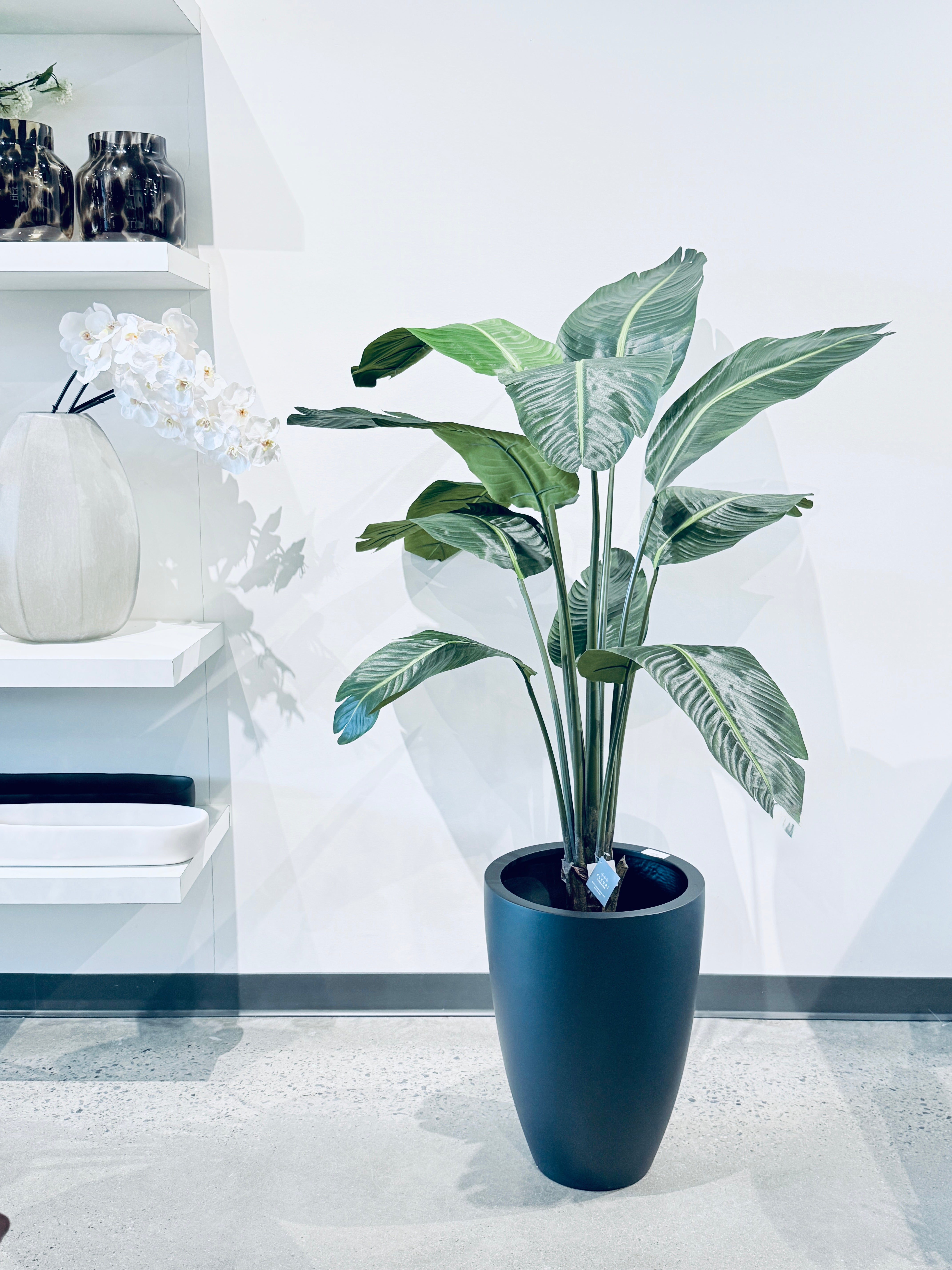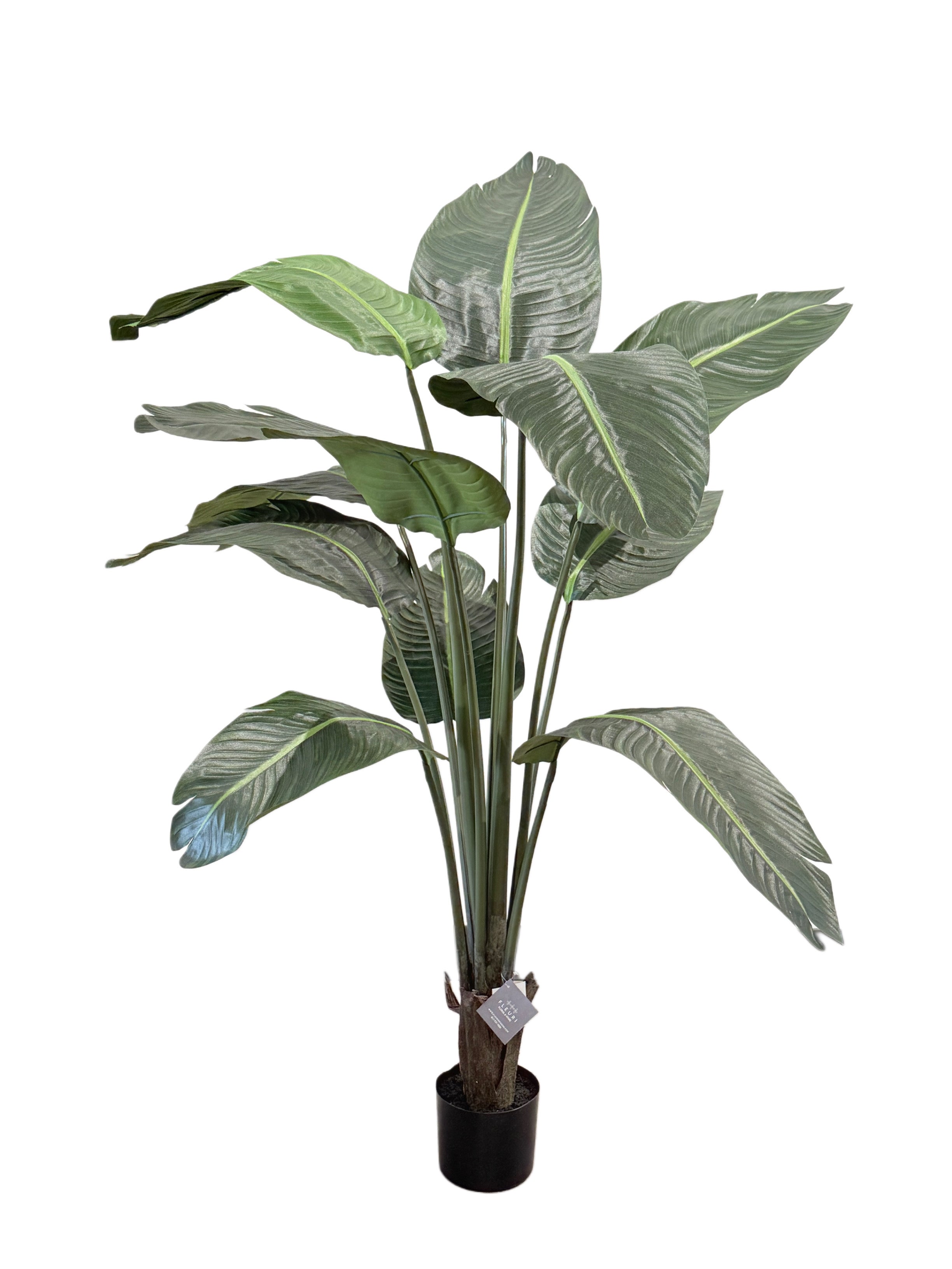 Bring a touch of tropical elegance to any space with this faux Traveler’s Palm. Designed with broad, sculptural leaves and finely detailed veining, this lifelike plant captures the iconic look of the real thing—without the maintenance. Multiple layered stems rise from a sturdy base, creating a full, airy silhouette that adds height and visual interest to interiors.