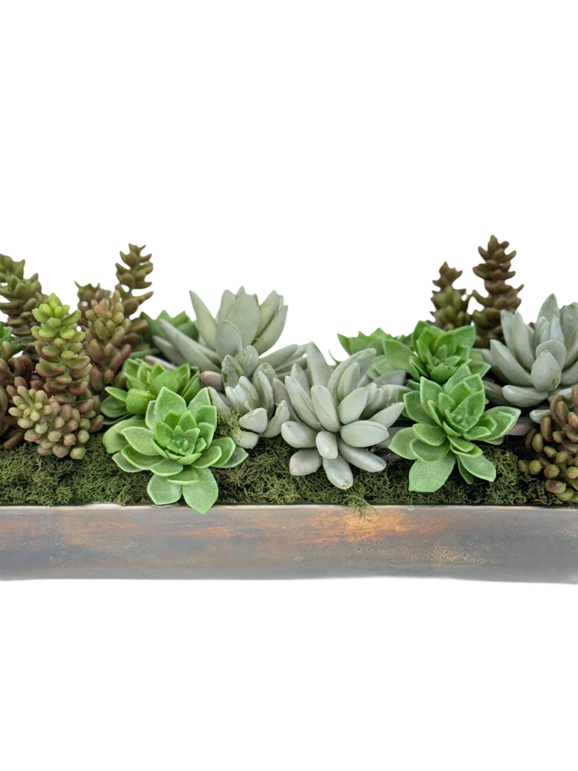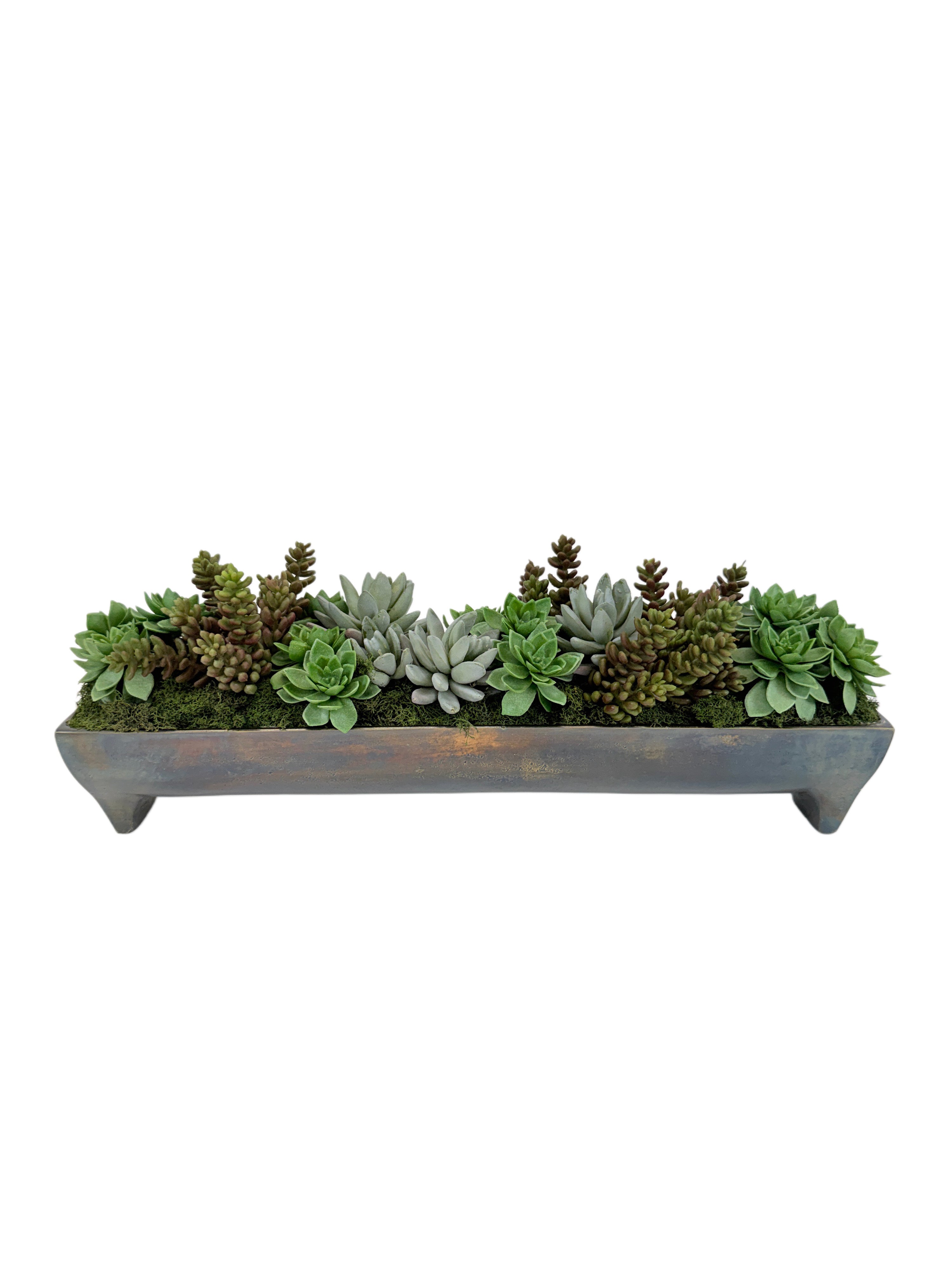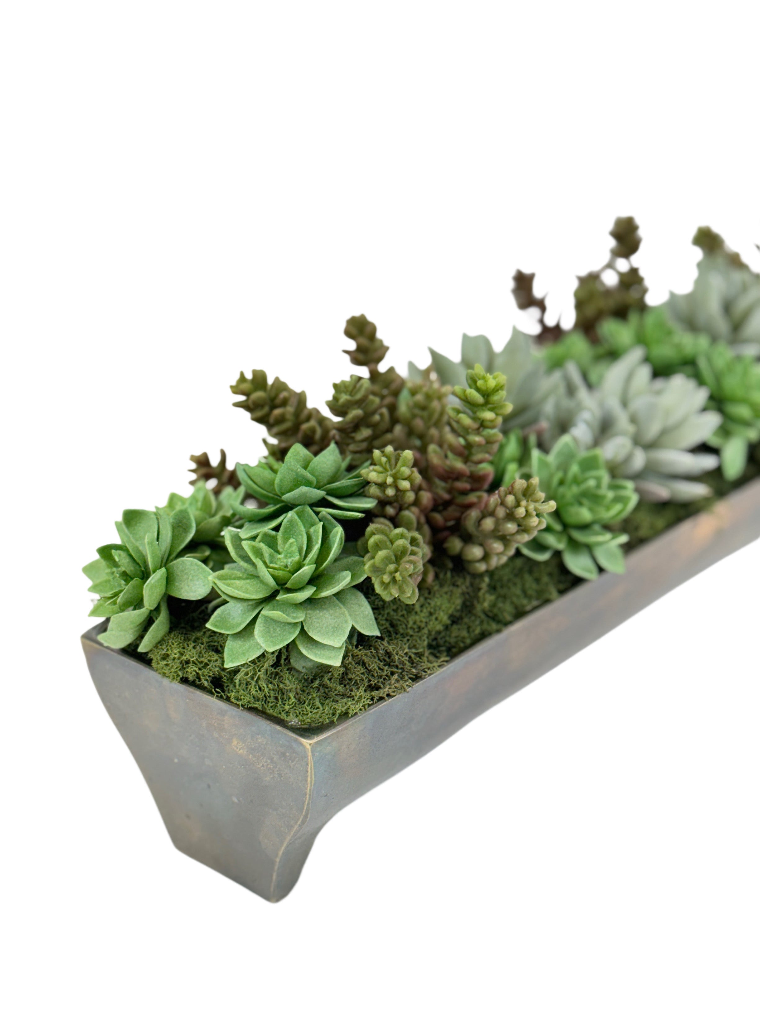 Fleuri faux succulents in cast metal antique gold color trough. Narrow and low and perfect for your table or bookshelf.