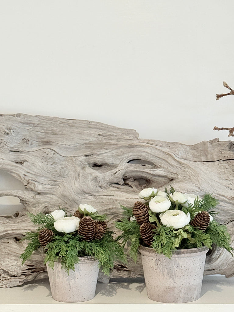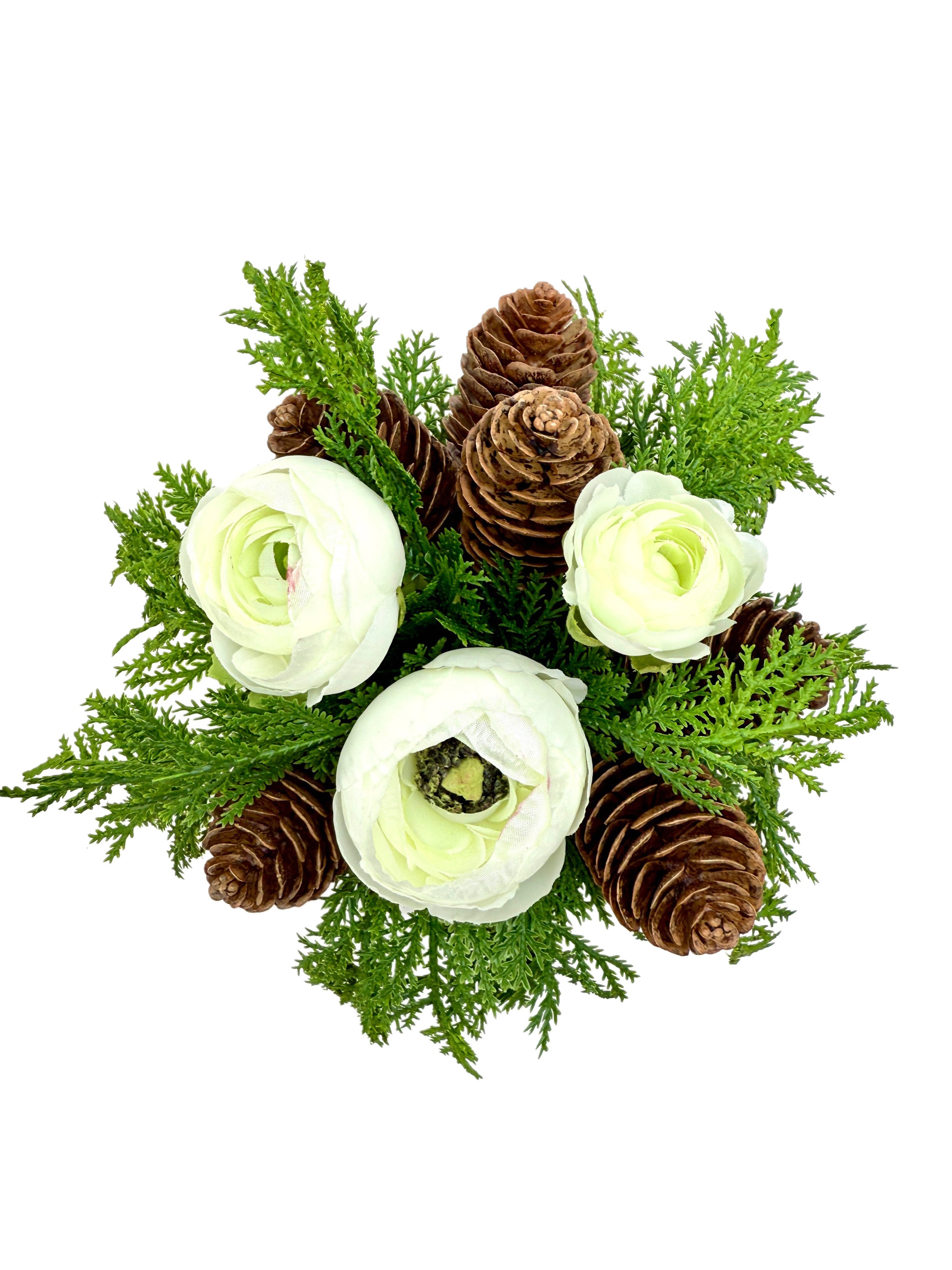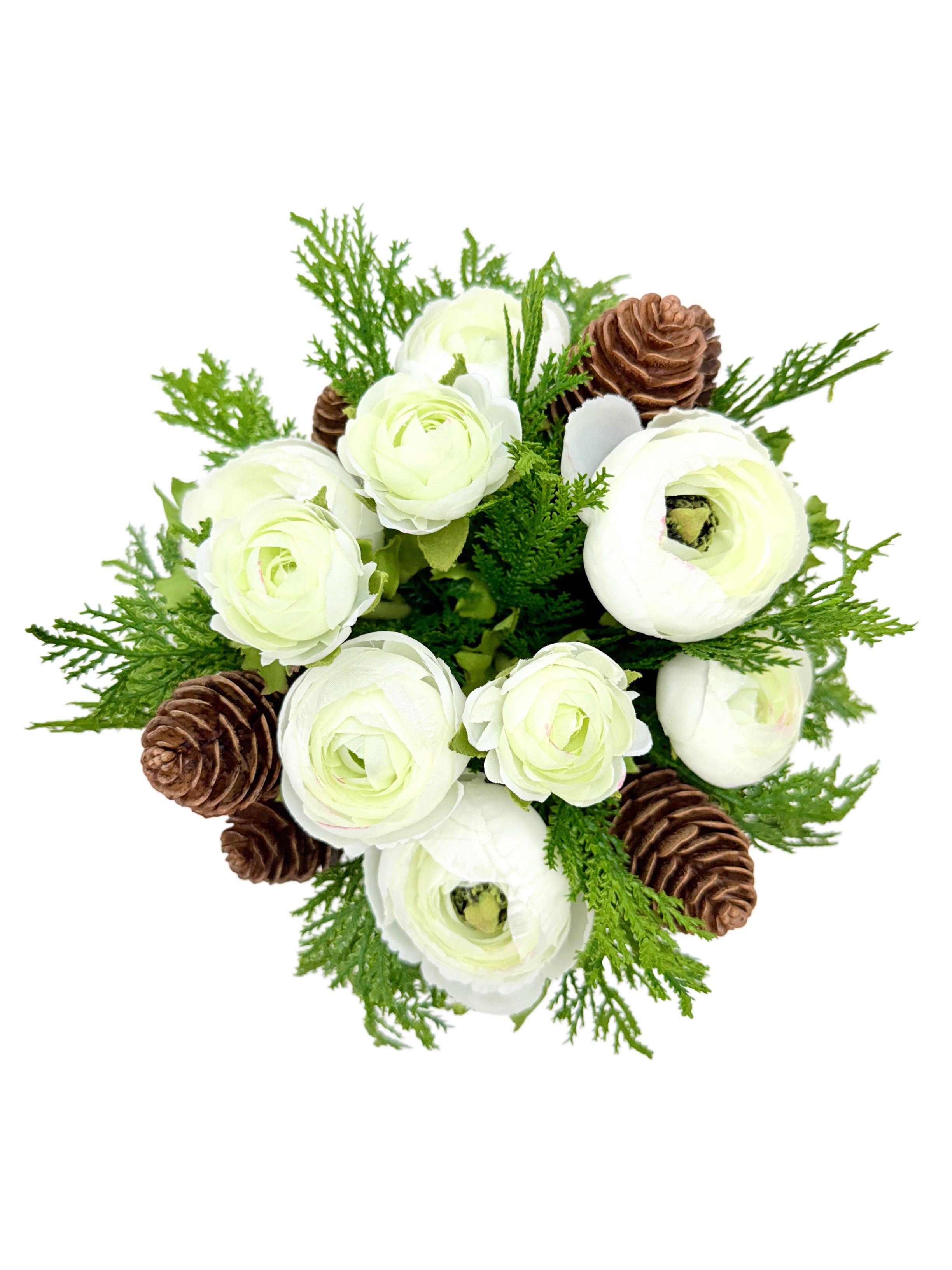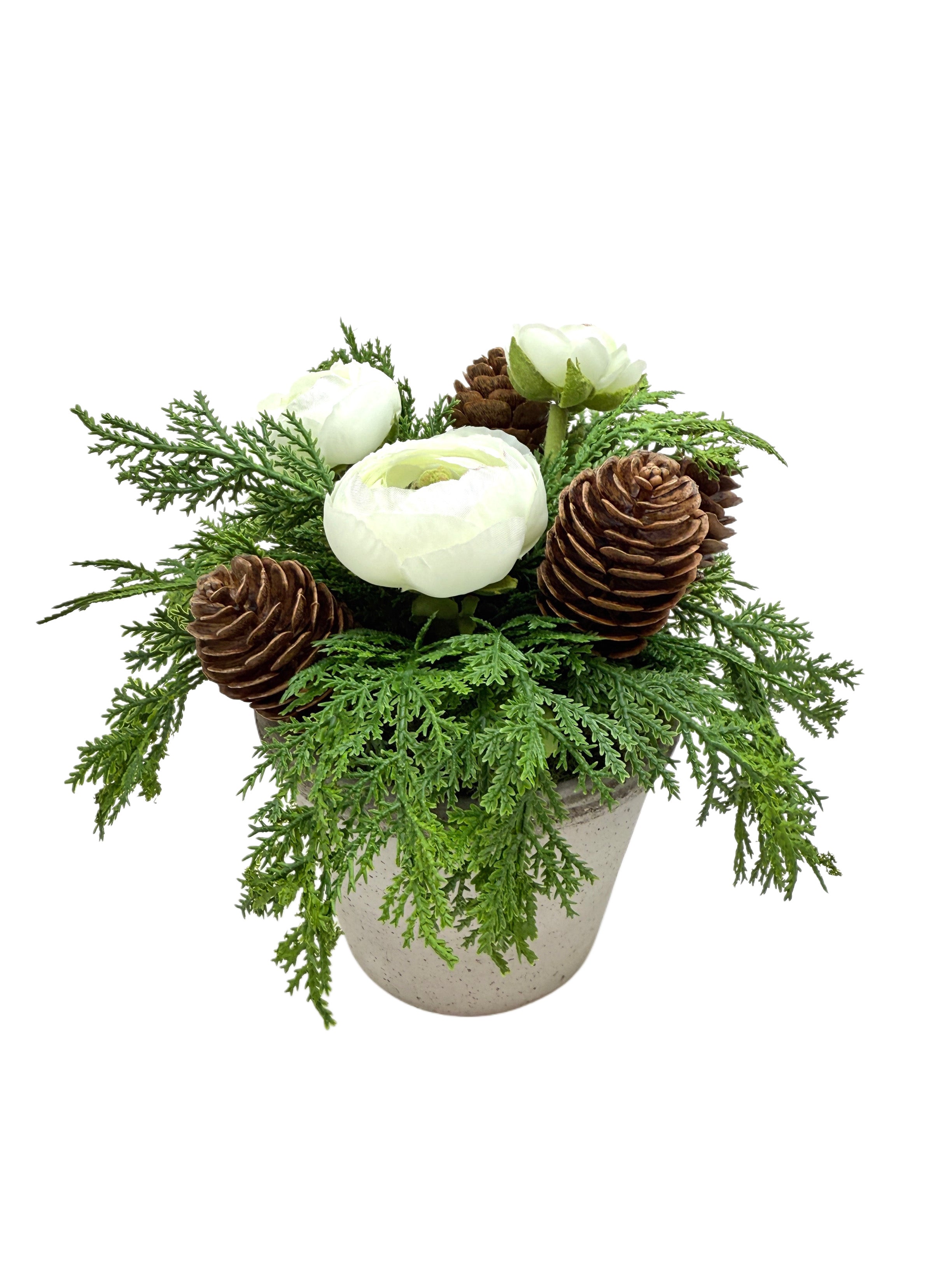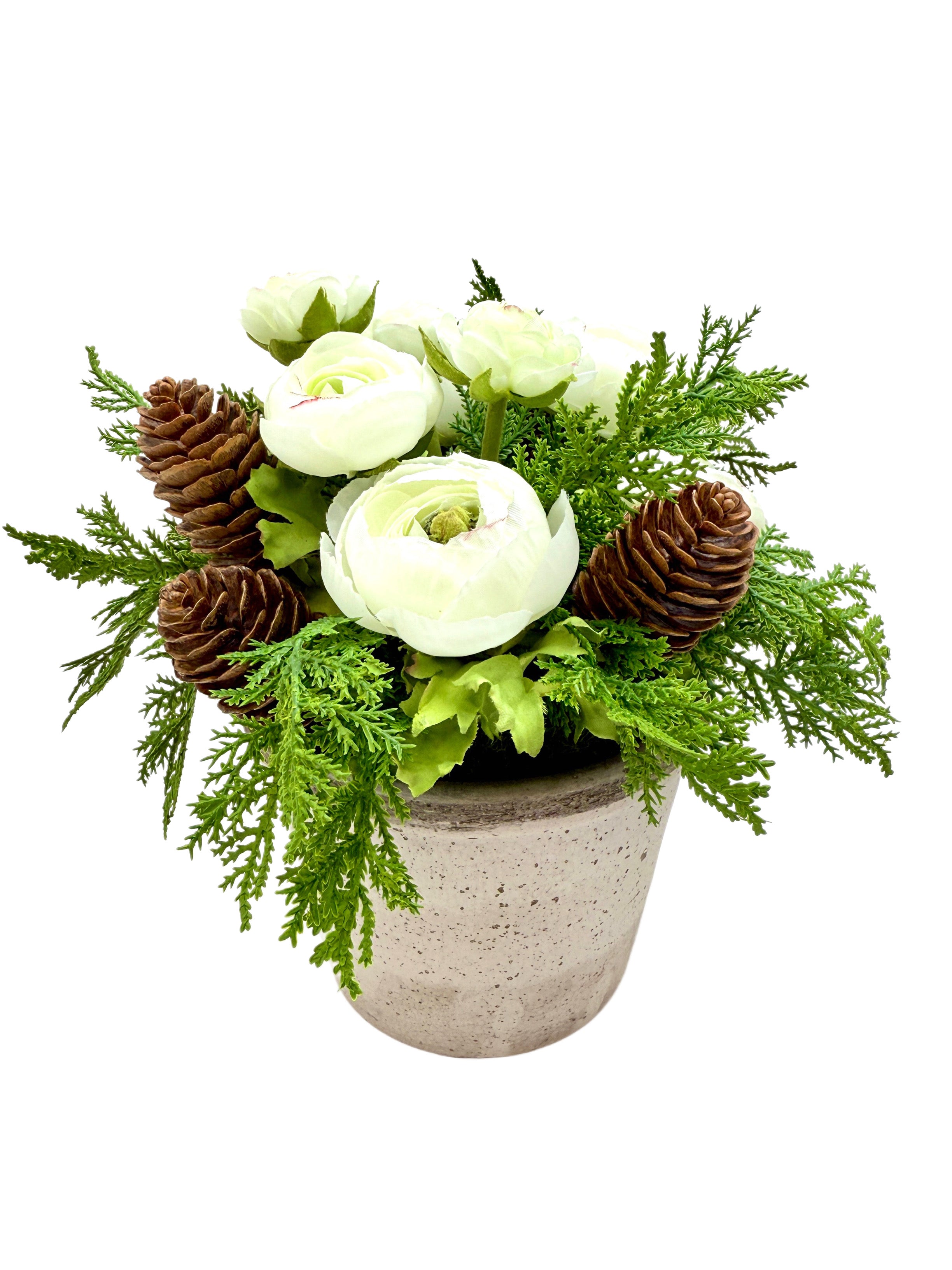 Introducing Fleuri's 2025 limited edition winter faux floral arrangement - The Neige. Perfect for the holiday season, a combination of faux soft white ranunculus, lush green cedar, and pine cones installed in a Bergs Potter light gray terra cotta pot.  A modern and elegant addition to your winter décor or holiday tablescape.