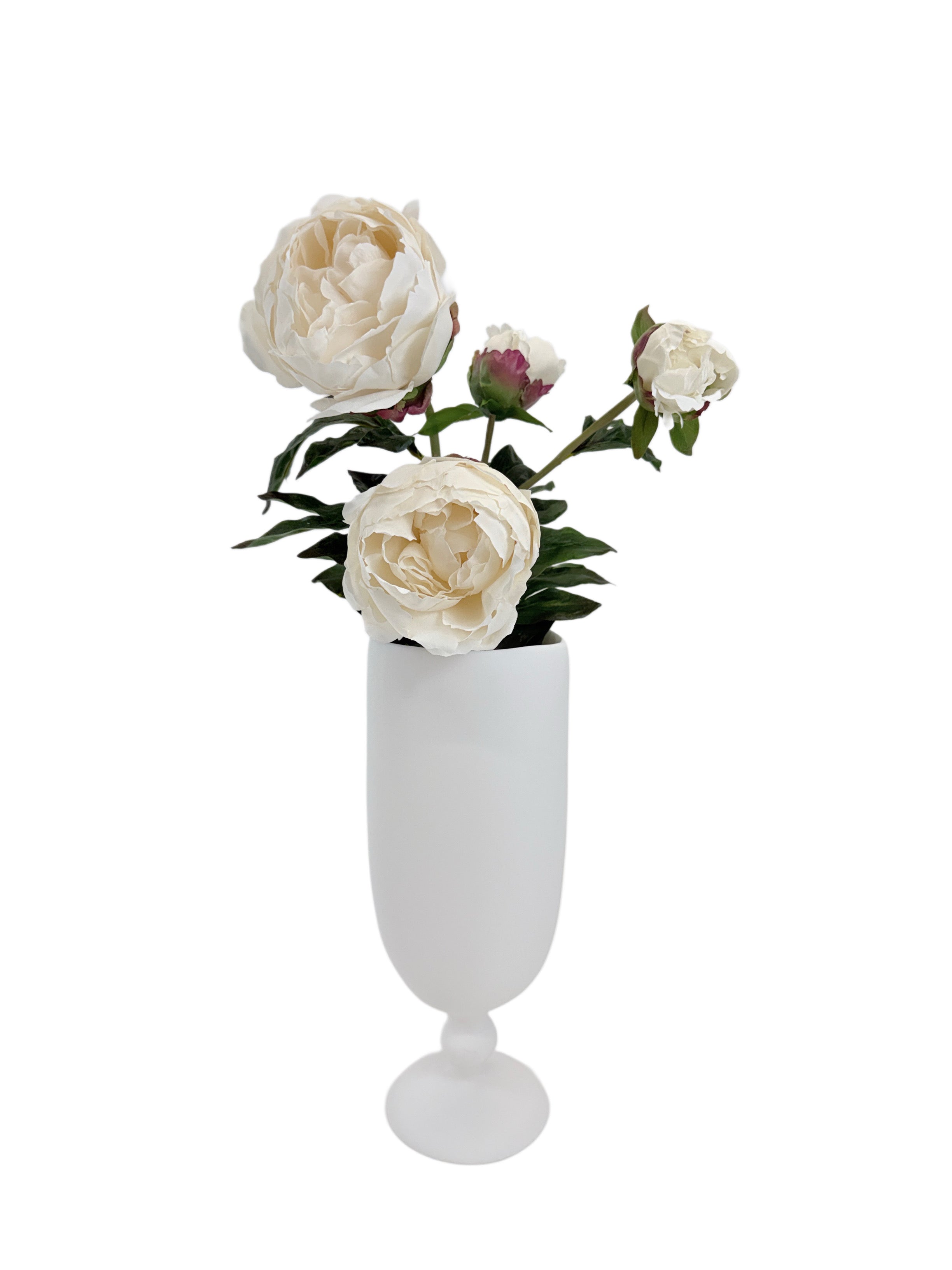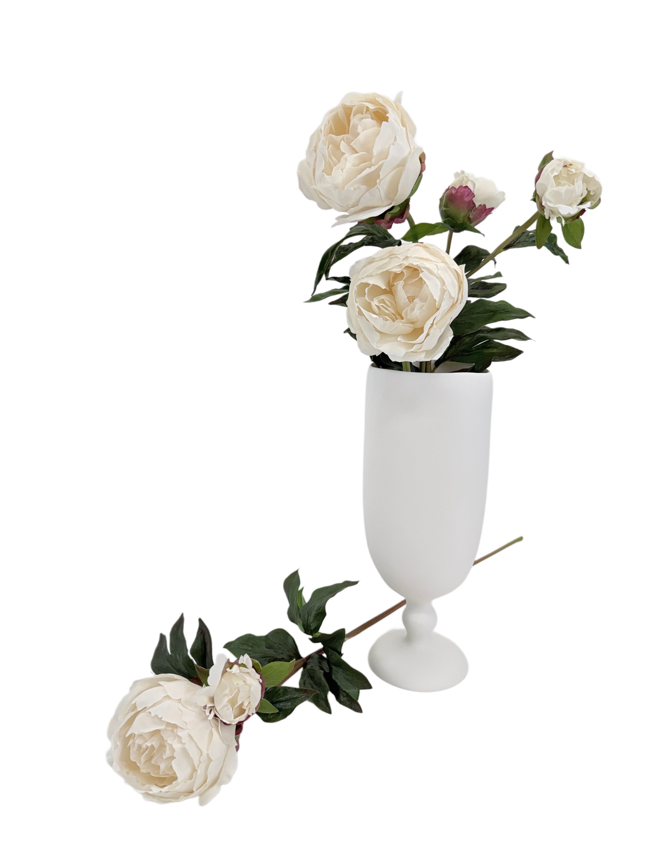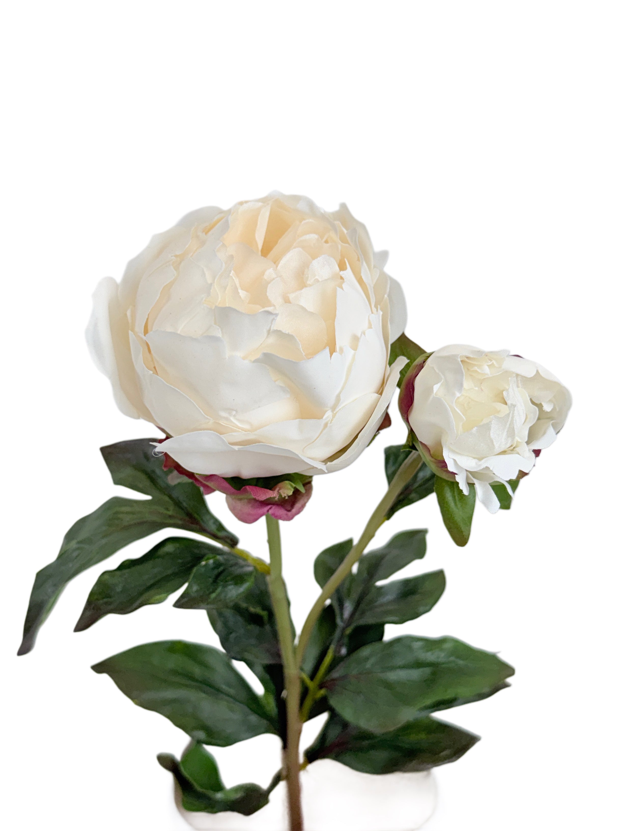 Creamy real touch faux peony flower stem. Measures approximately 27" tall with wired stem that can be shaped and/or cut with wire cutters to fit your container.